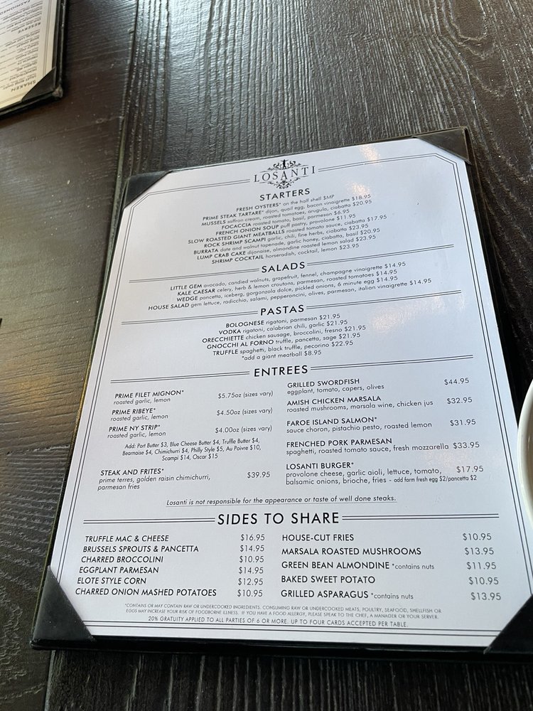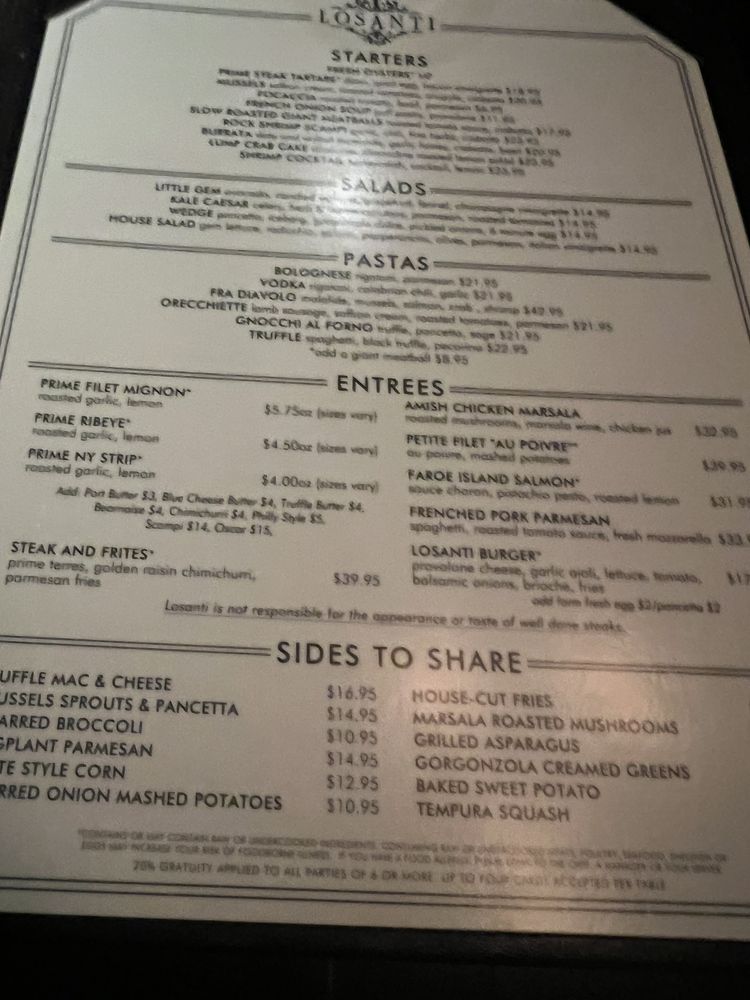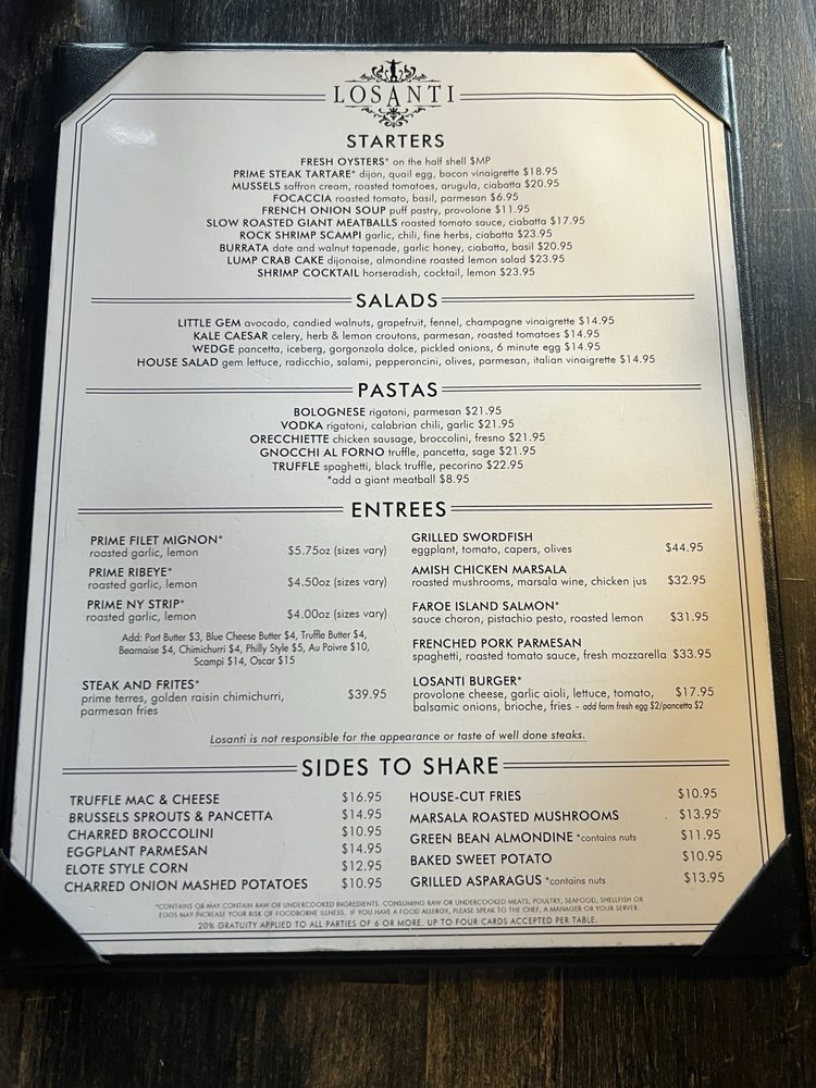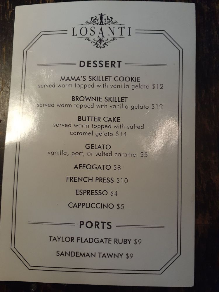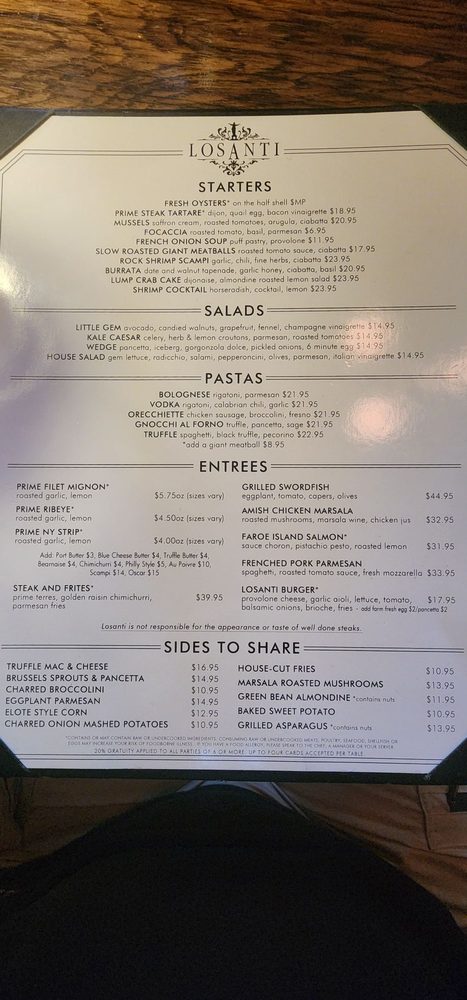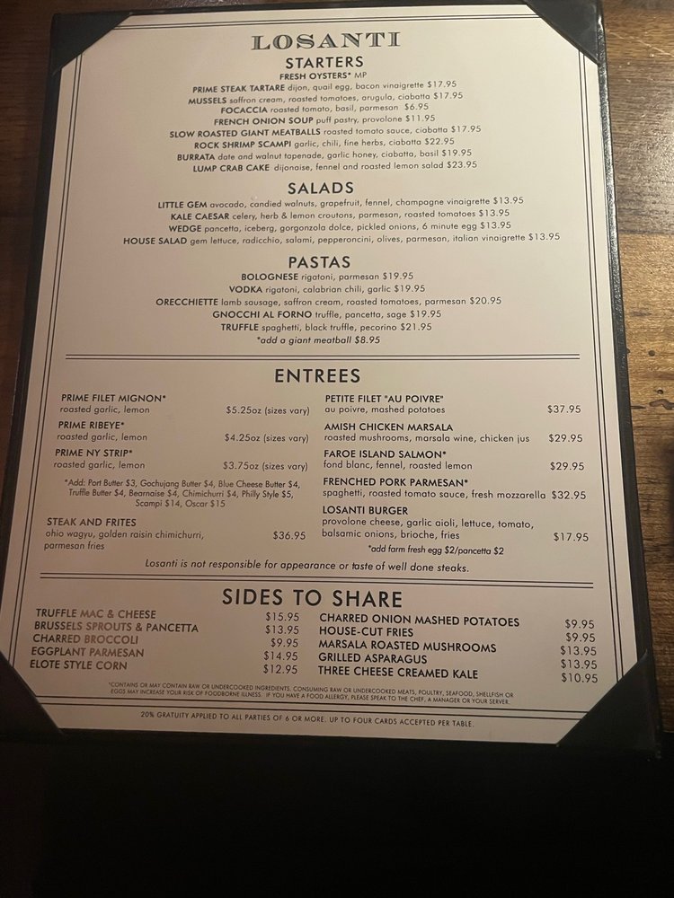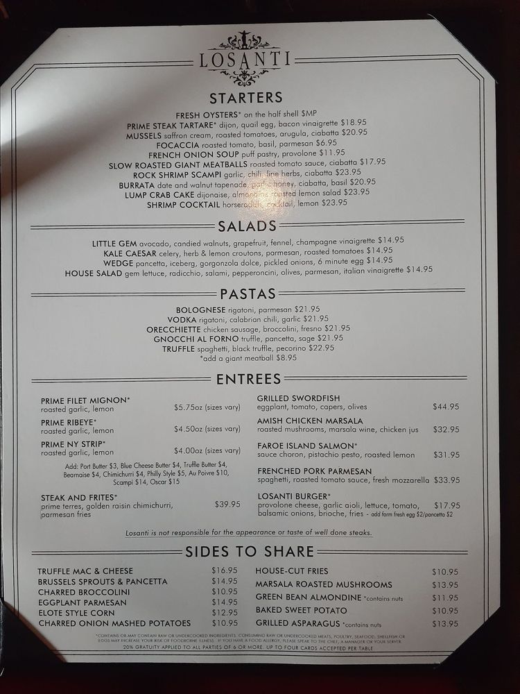 Introducing the menu at Losanti, a trendy and upscale wine bar-steakhouse located in Cincinnati, OH. This intimate and romantic restaurant offers a cozy outdoor seating area with temperature control, making it ideal for year-round dining. While the steak may be hit or miss, the oysters and desserts shine brightly. The fresh and flavorful fillet mignon steak receives high praise from patrons, as well as the kale caesar salad and espresso martini. Don't miss the butter cake and the Lillit Rose cocktail for a sweet finish to your meal. Despite the upscale atmosphere, the service is attentive and welcoming, making Losanti a great spot for a quiet celebration or a date night. Reservations are recommended, especially for prime seating by the window overlooking Washington park. Experience a delightful evening at Losanti, where the food and ambiance make for a memorable dining experience.